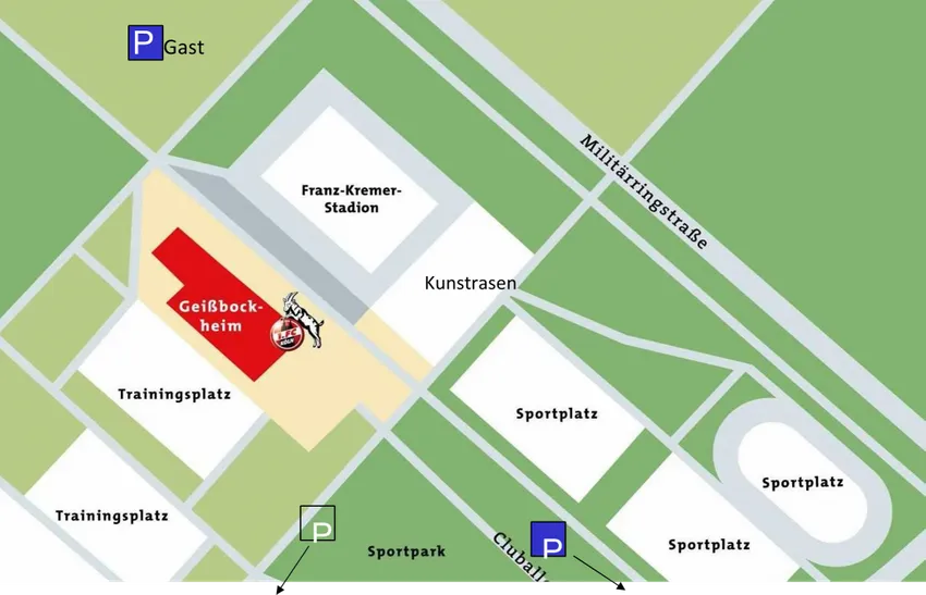 Über die A4 Ausfahrt Klettenberg Richtung Innenstadt bis zum Militärring. Von dort der Ausschilderung „Geißbockheim“ folgen.